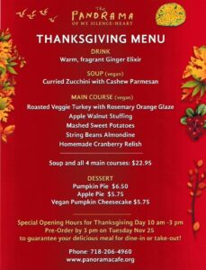 YES! Panorama will offer a Thanksgiving Special this year! All vegan menu includes Warm Ginger drink, Curried Zucchini Soup, Roasted Veggie Turkey wth Rosemary Orange Glaze, Apple Walnut Stuffing, Mashed Sweet Potatoes, String Beans Almondine and Homemade Cranberry Relish. All for $22.95 (cash price). Please call to pre-order and guarantee your meal by Tuesday, November 25 at 3 pm. Meals will also be available on a first-come, first-served basis on Thanksgiving Day if you do not get a chance to pre-order! And don’t forget to add dessert – Pumpkin Pie, Apple Pie or Vegan Pumpkin Cheesecake available for additional $5.75 each (cash price).